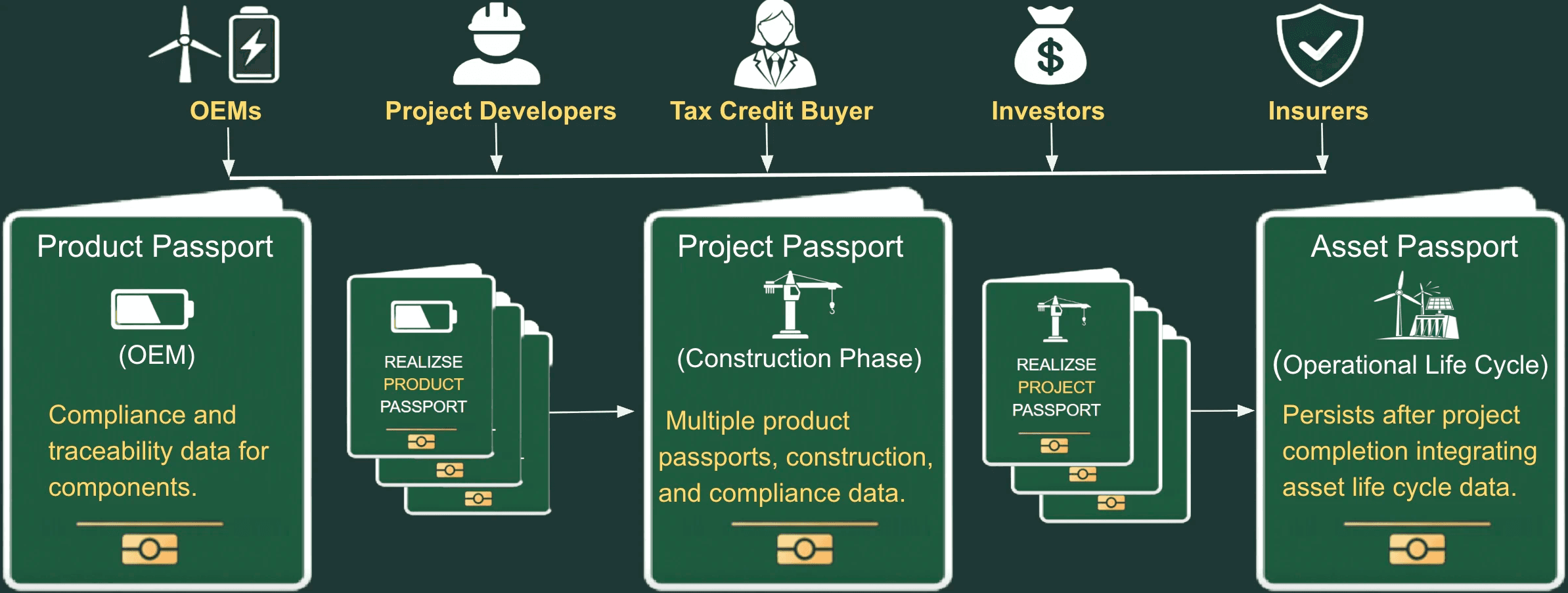 Realizse connects every stage of a clean-energy project — from OEM components to construction and operation — creating a continuous, verified chain of compliance.